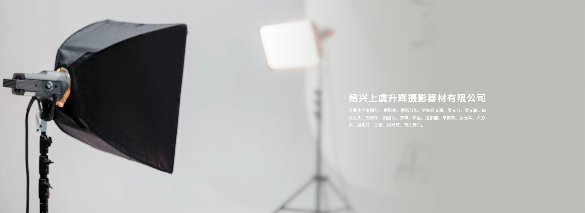 紹興上虞升輝攝影器材有限公司專業生產直播燈、 攝影棚、攝影燈架、鋁制反光罩、柔光燈、柔光箱、單雙燈頭、三腳架、拍攝臺、鐵罩、轉盤、連接器、懸臂架、反光傘、大力夾、攝影燈、沙袋、閃光燈、萬向轉頭。